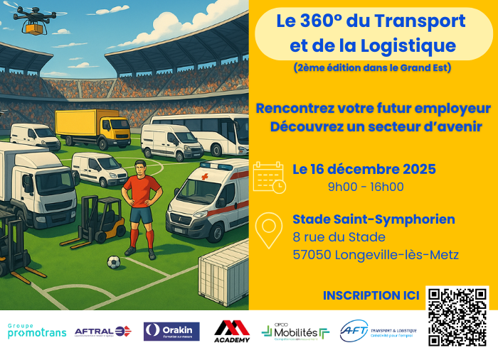 La 2e édition du 360° du Transport/Logistique s’est déroulé le 16 décembre 2025, au stade Saint Symphorien de Longeville-Lès-Metz en partenariat avec l’OPCO Mobilités, Promotrans, Aftral, Orakin et Mauffrey Académie.