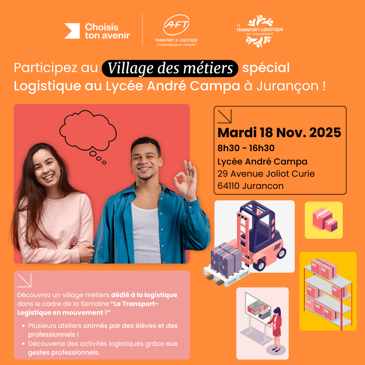 Dans le cadre de la semaine du Transport et de la Logistique l'AFT s'associe au lycée A.CAMPA à Jurançon pour organiser un village des métiers de la logistique.