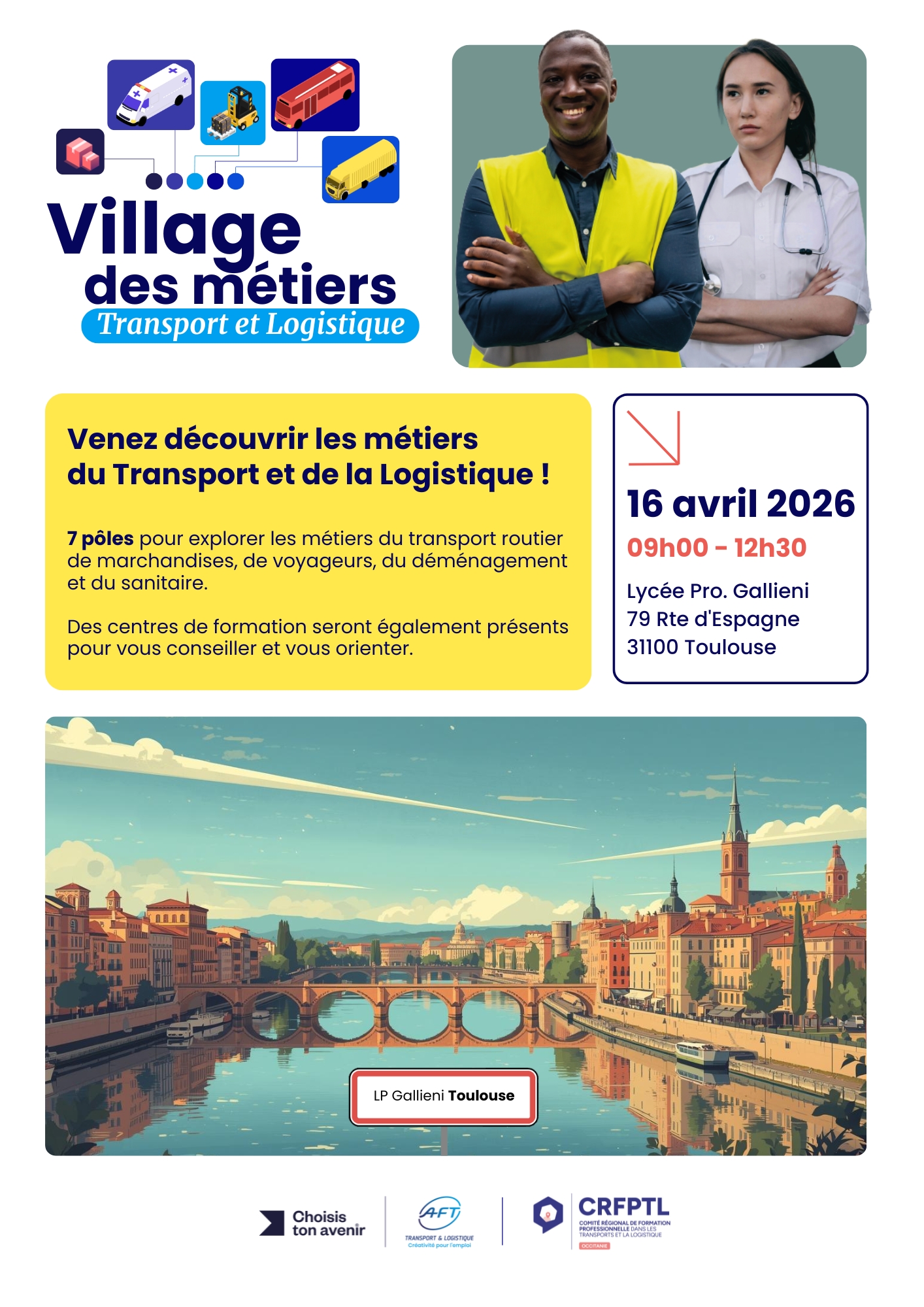 Organisée par la délégation régionale AFT Occitanie et le CRFPTL Occitanie, cette manifestation a rassemblé l’ensemble des acteurs du secteur autour d’un objectif commun : accompagner les jeunes dans leurs choix d’orientation et renforcer l’attractivité des métiers du transport et de la logistique.