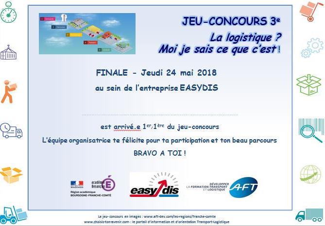 12 élèves se sont retrouvés jeudi 24 mai 2018 pour la finale du grand jeu-concours organisé par l'AFT en partenariat la plateforme logistique Easydis de Besançon et la cellule école-entreprise de la DAFPIC / Rectorat de l'Académie de Besançon, dont l'objectif était de faire découvrir de façon ludique et immersive les métiers de la logistique aux collégiens et collégiennes de 3e.