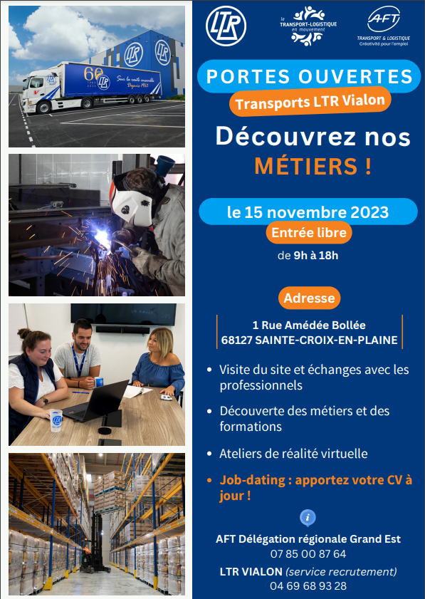 Dans le cadre de la semaine Transport et Logistique en mouvement, rendez-vous le 15 novembre 2023, de 9h à 18h à Ste Croix en Plaine pour découvrir l'entreprise LTR Vialon