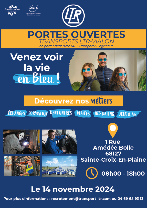 Le jeudi 14 novembre 2024, de 8h à 18h, ne manquez pas de venir découvrir l'entreprise LTR Vialon à Ste Croix en Plaine dans le Haut-Rhin.
