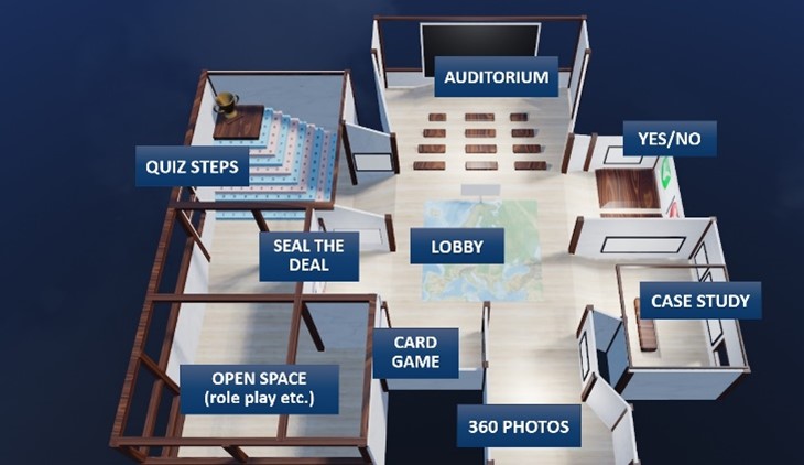 To provide an immersive tool, which encourages collaborative working and studying, we have used the Mozilla Hubs 3D collaboration platform to create virtual rooms where participants meet and work virtually with the help of avatars. Avatars can chat and interact by sharing photos, presentations, 3D objects, etc.